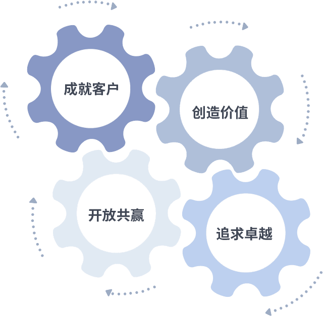 成就客户是一切决策的出发点,,,创造价值是衡量所有工作的标准,,追求卓越是我们做事做人的态度,,,开放共赢是我们的格局也是最终的结果。。。价值观的齿轮环环相扣,,推动着组织里的每个人不断向前。。