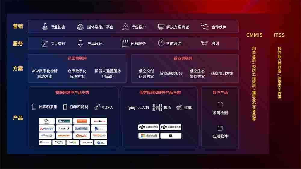 聚合国内外先进的物联网硬件产品品牌,,,,聚焦数字化仓储、、机器人运营、、、低空智联网等领域,,,共同打造适合客户业务场景的解决方案并提供交付服务