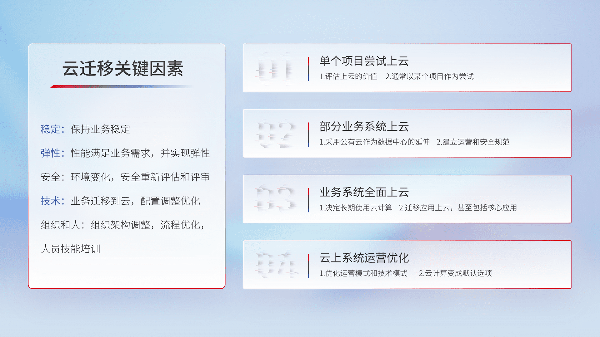 结合实际业务,,从规划设计、、云平台选型、、、云原生改造、、、、数据迁移、、、、集成交付,,,迁移全过程为客户识别最佳上云路径,,,做好风险识别管理,,,设计网络架构、、身份权限、、安全审计合规、、操作审计、、、日志审计、、、监控告警策略、、、、多站点容灾设计等,,,,对云上基础设施进行整体规划,,,提升IT治理水平,,,以满足弹性、、高可用、、、高性能的需求。。。。