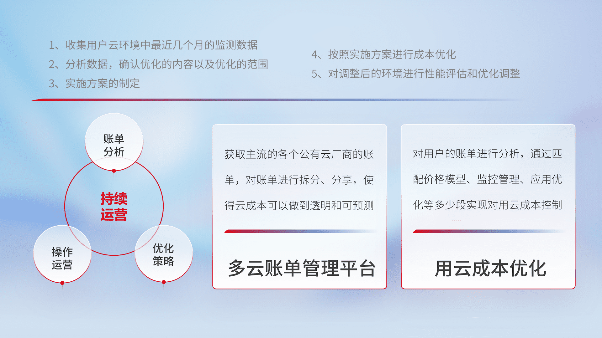 通过多云纳管,,,,以统一的资源数据模型把客户的云资源进行抽象和封装,,,进而实现对多云资源的统一操作,,,保障云资源管理的可靠性、、、、稳定性与可用性。。。量身定制化运维内容,,,,配置、、开发运维、、、补丁管理、、、备份、、、监控、、、、认证和访问管理、、、审计和日常巡检等,,,,保障在用云过程中的可靠度,,,稳定度以及高可用率。。。